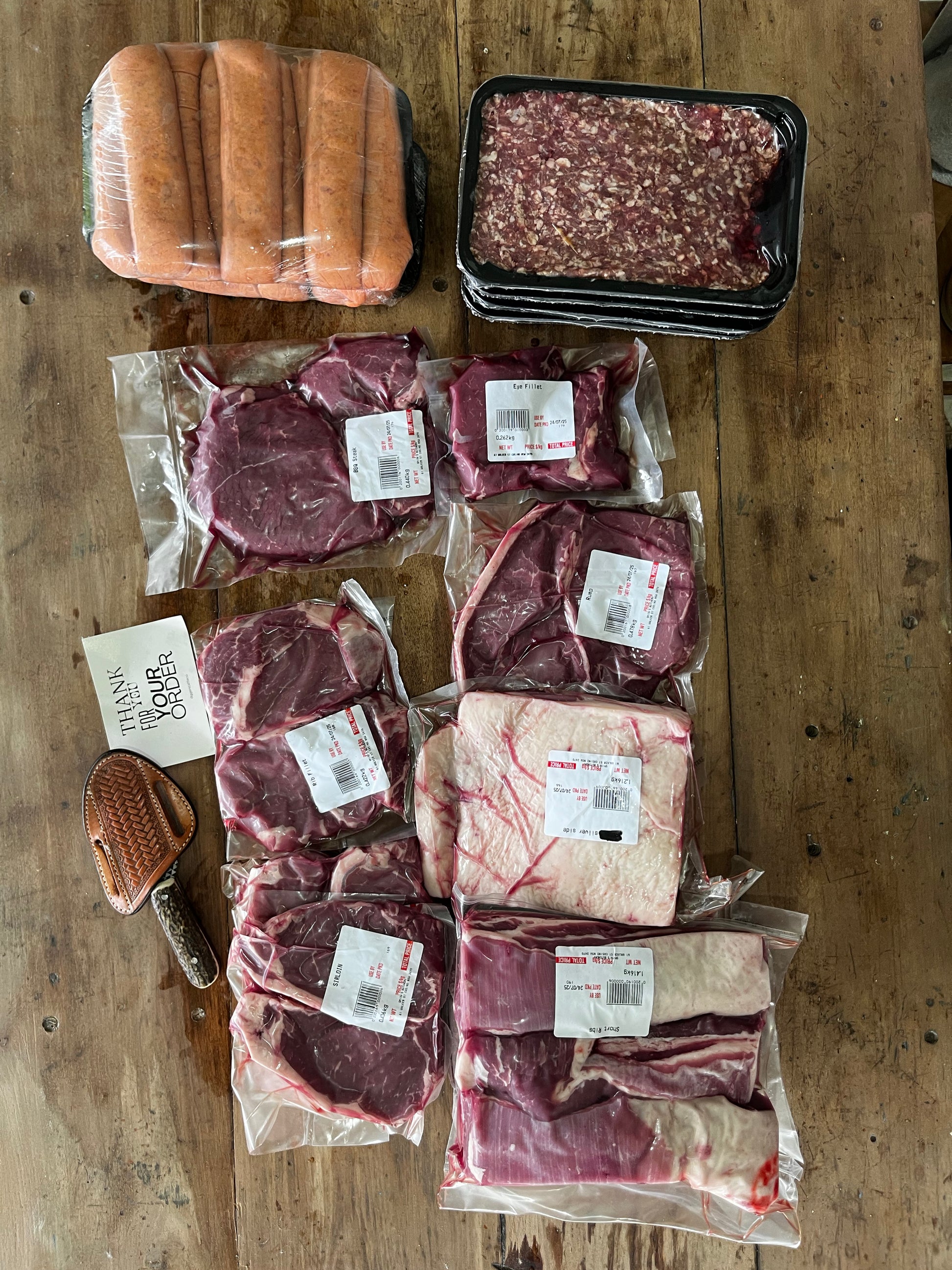 The Quarter Pack is perfect for families or carnivores, offering 40kg+ of premium, grass-fed beef. You’ll get a mix of tender steaks, roasting cuts, beef mince, slow-cook favorites, and butcher's sausages made with gluten-free ingredients.